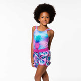Une bordure violette éclatante apporte la touche finale parfaite à notre Short maillot imprimé ananas bleu et mauve. Ce short coloré est fabriqué à partir d'un tissu 100% polyester recyclé et présente une silhouette à enfiler avec une taille élastique à cordon, un ourlet dauphin incurvé et un imprimé sur toute la surface vibrant.