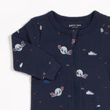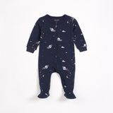 Vous verrez ses yeux s’illuminer quand il s’apercevra que sa dormeuse toute neuve brille dans le noir ! Ce petit pyjama bleu marine est couvert de notre motif phosphorescent à l’effigie du Père Noël sur son traîneau distribuant les cadeaux. Confectionné en coton biologique côtelé, ce vêtement est confortable et souple ; bébé pourra ainsi bouger et gigoter allègrement. Dotée de pieds intégrés et de poignets élastiqués, cette dormeuse les gardera au chaud toute la nuit.